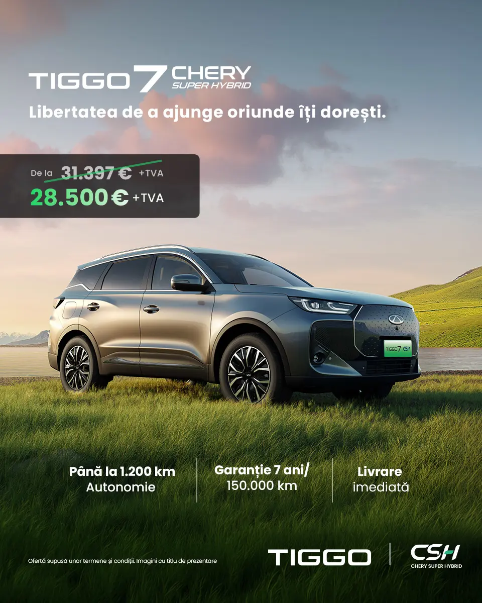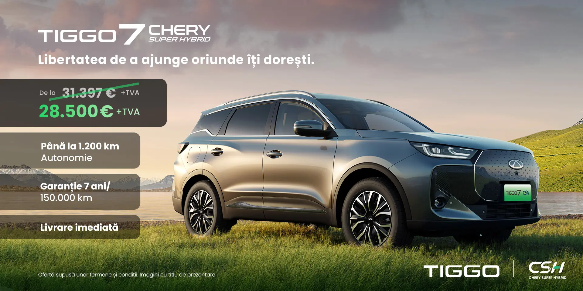 Ofertă pentru TIGGO 7 CSH, 1.5 TGDI DHT 279 CP, versiunea Unique, pentru persoane juridice. Ofertă pentru persoane fizice: 34,490 euro (TVA inclus), respectiv 174.864 lei (TVA inclus). Valoarea în lei este calculată la un curs estimativ de 1 euro = 5,07 lei și poate varia în funcție de cursul valutar din data achiziției.