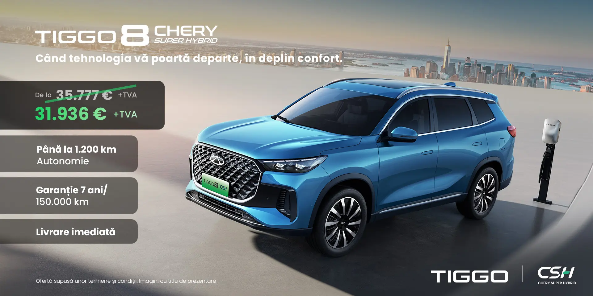 Ofertă pentru TIGGO 8 CSH, 1.5 TGDI DCT 279 CP, versiune Unique, pentru persoane juridice. Ofertă pentru persoane fizice: 38.642 euro (TVA inclus), respectiv 195.915 lei (TVA inclus). Valoarea în lei este calculată la un curs estimativ de 1 euro = 5,07 lei și poate varia în funcție de cursul valutar din data achiziției.